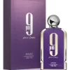 El diseño del frasco de 9 PM Pour Femme suele ser elegante y moderno, a menudo en tonos oscuros como el negro o el morado profundo, con detalles dorados o rosados que reflejan la sofisticación y el carácter nocturno de la fragancia. Su forma sólida y femenina transmite una sensación de lujo y presencia.