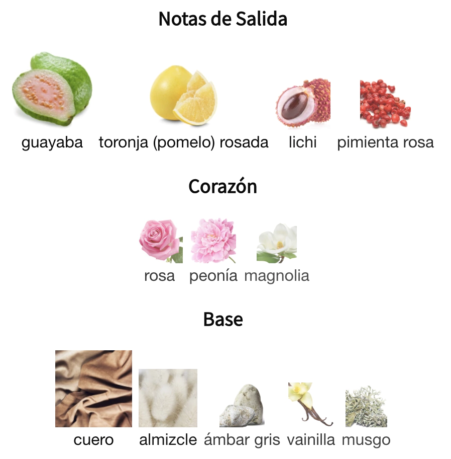 - Fondo cremoso, dulce, almizclado y envolvente con vainilla y sándalo.