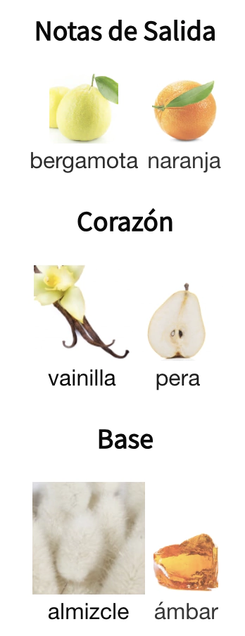 - Fondo cálido, amaderado suave, almizclado y dulce.