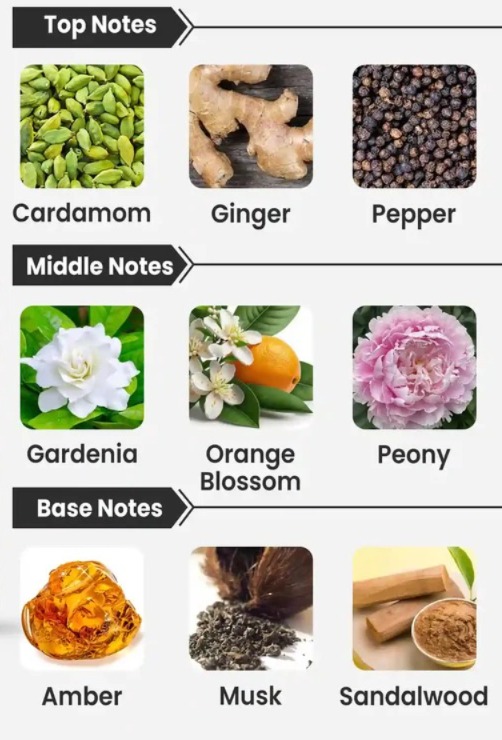 Jubilant Noir te recibe con una explosión cálida y especiada que inmediatamente captura la atención. El cardamomo y la canela se combinan para ofrecer una apertura rica y ligeramente dulce con un toque picante y exótico. El azafrán añade una faceta lujosa y ligeramente coriácea, mientras que la bergamota aporta un brillo cítrico sutil que equilibra la intensidad de las especias.